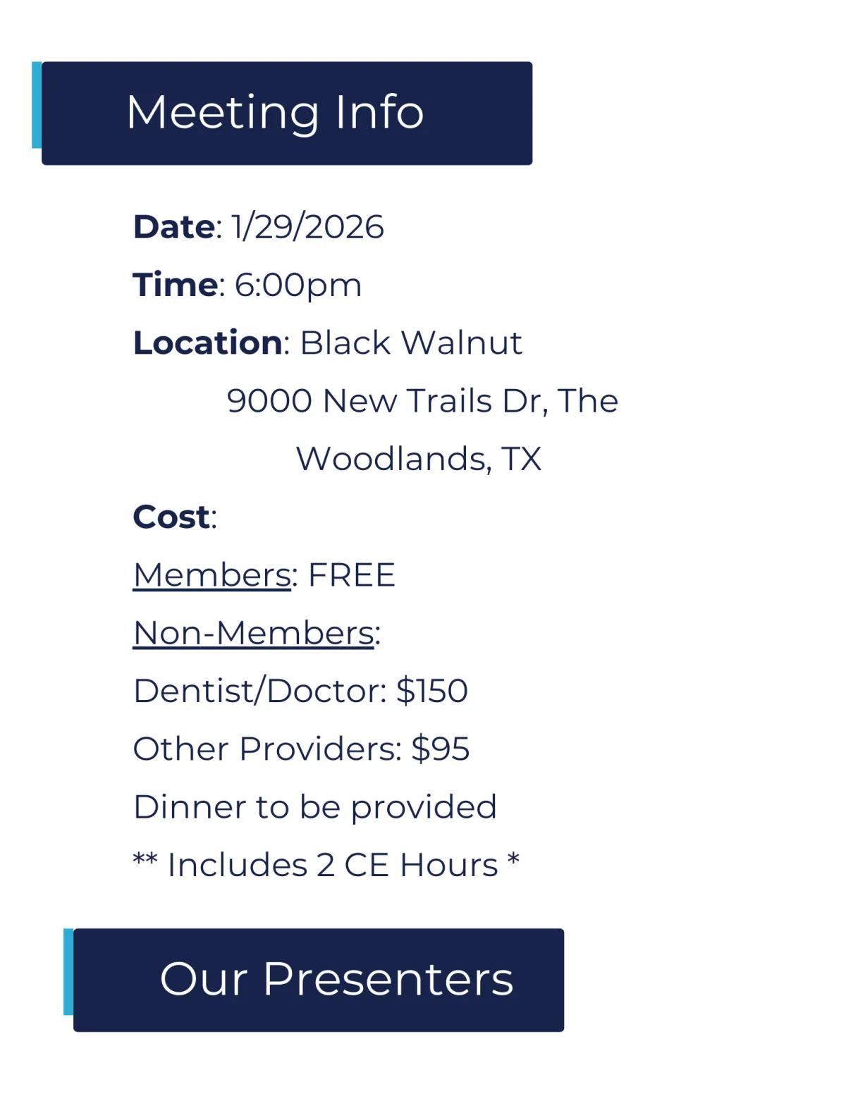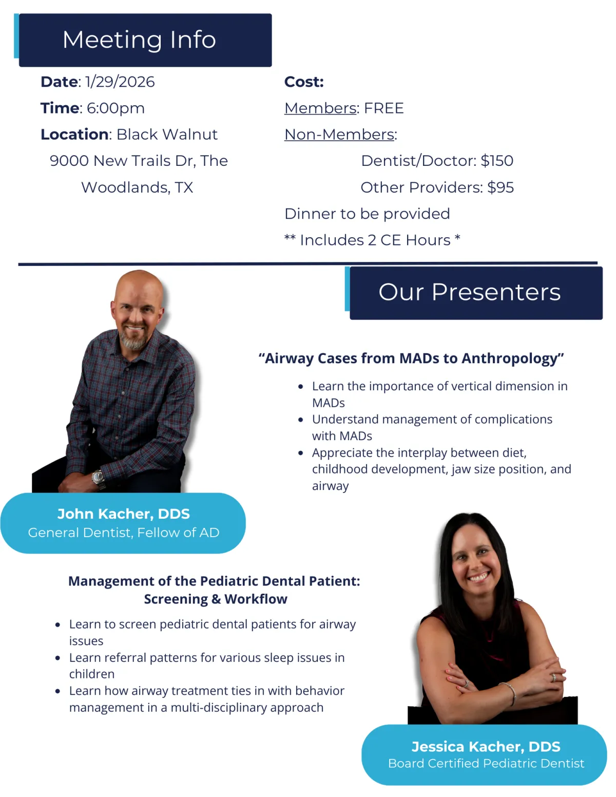 Meeting 1: The Grand Lecture. Our high-level academic evening with a guest speaker or two and 2 CE credits. (1 staff member for Dentist/Doctor members join for free!)